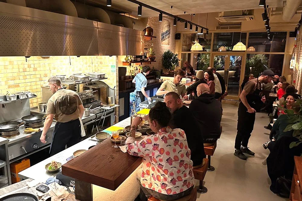Kolae is compact. Blush pink walls (never twee), small tables hugging the edges, and a sweeping counter wrapped around an open kitchen that periodically bursts into flame. It’s loud, energetic, alive. Even if it were half empty, the kitchen would create its own atmosphere, but good luck finding it half empty.