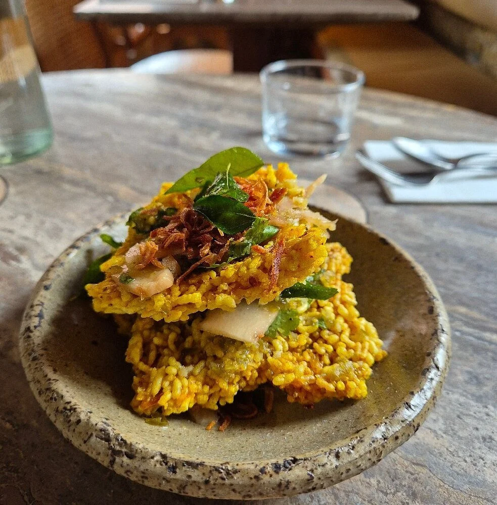 We began with biryani crackers – light, spicy, addictive. Then, herb fritters made with kale (a vegetable I typically avoid). These were extraordinary: crisp, like a prawn cracker from an Irish Chinese takeaway, served with a caramel-fish-sauce dressing that hit sweet, salty and savoury all at once. One of the best bites of the night.